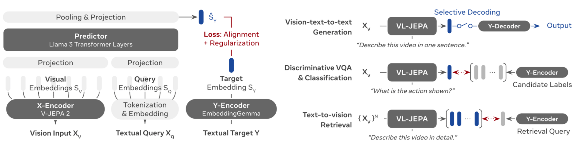 VL-JEPA Architectural Details, and task specific execution. Image Source: https://arxiv.org/pdf/2512.10942