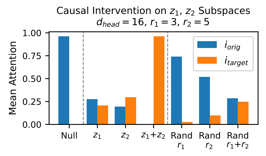 Here, we can see that when we only make changes to either z1 or z2, the attention shift is relatively small. However, when both are changed, attention moves entirely to the target value. This shows us that the attention is correlated with the values of z1 and z2, and interchanging them between keys has a large effect on how attention operates.