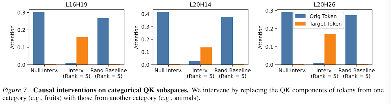 Similar results were found for the causal interventions on replacing QK components of tokens from one category to another, in tandem with the intervention analysis above. However, the authors note that the attention does not shift completely, highlighting that there might be some other underlying mechanisms operating in the QK space which they do not elaborate on.
