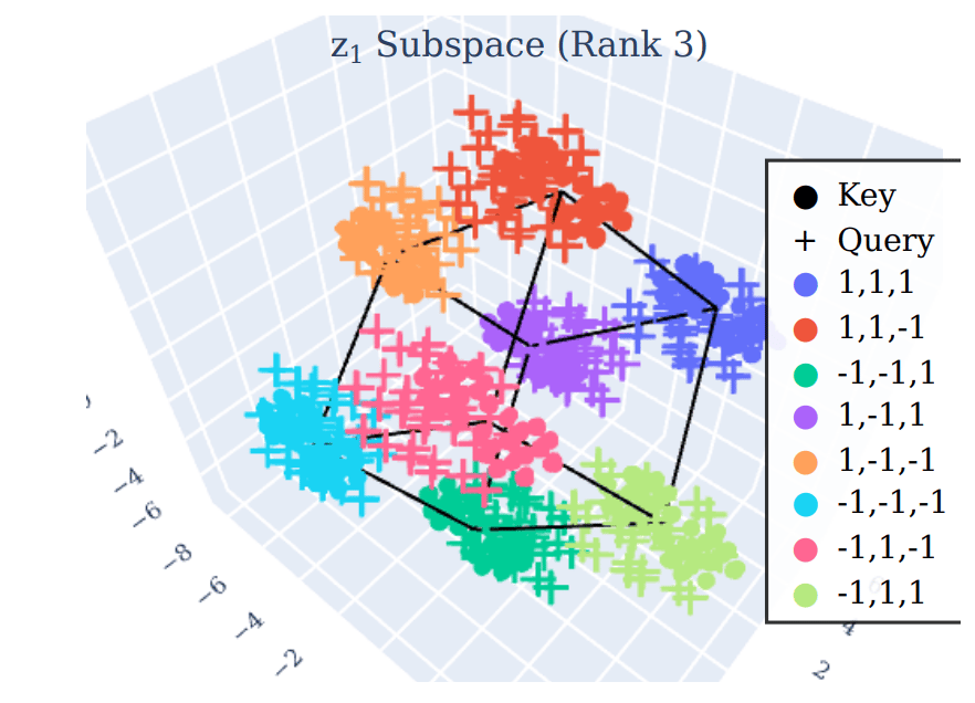 Empirically, the projection of the query and key values into the reduced U:r1 and V:r1 should retrieve the correct values of z1. Applying PCA to the recovered subspace of z1 with rank 3, we receive a cube-like structure (since each of the three values can only be 1 or -1). The projections of query and key values clearly align onto this structure