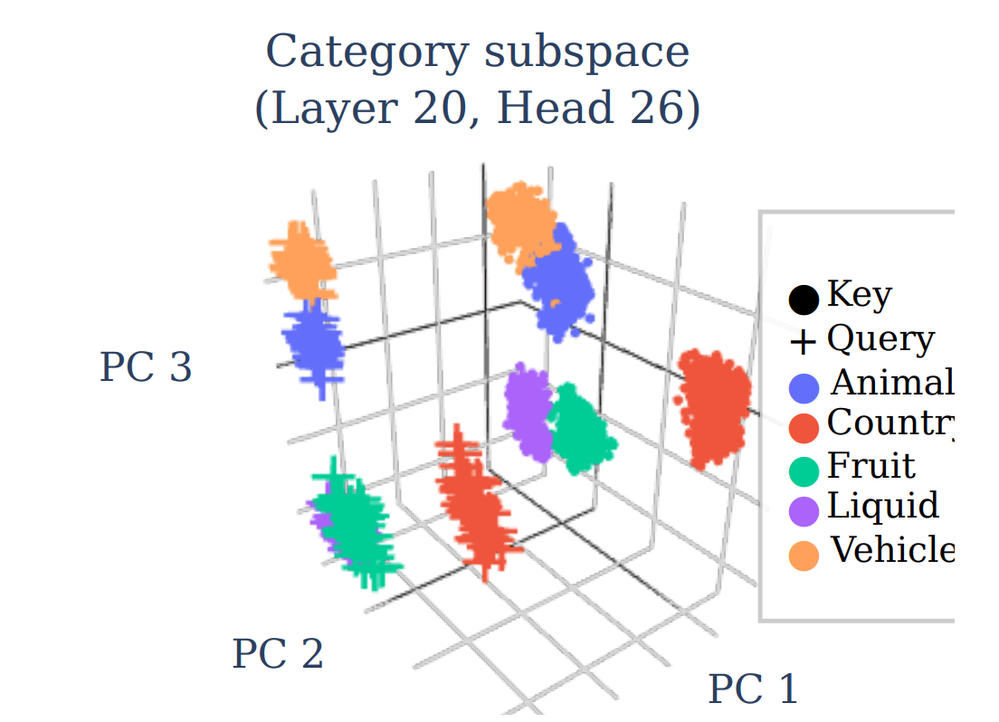 When the visualisation for recovering latent subspaces is applied on Llama 3.1-8B, they observed clear clusters corresponding to each category, as well as symmetric alignment between query and key values belonging to the same category.