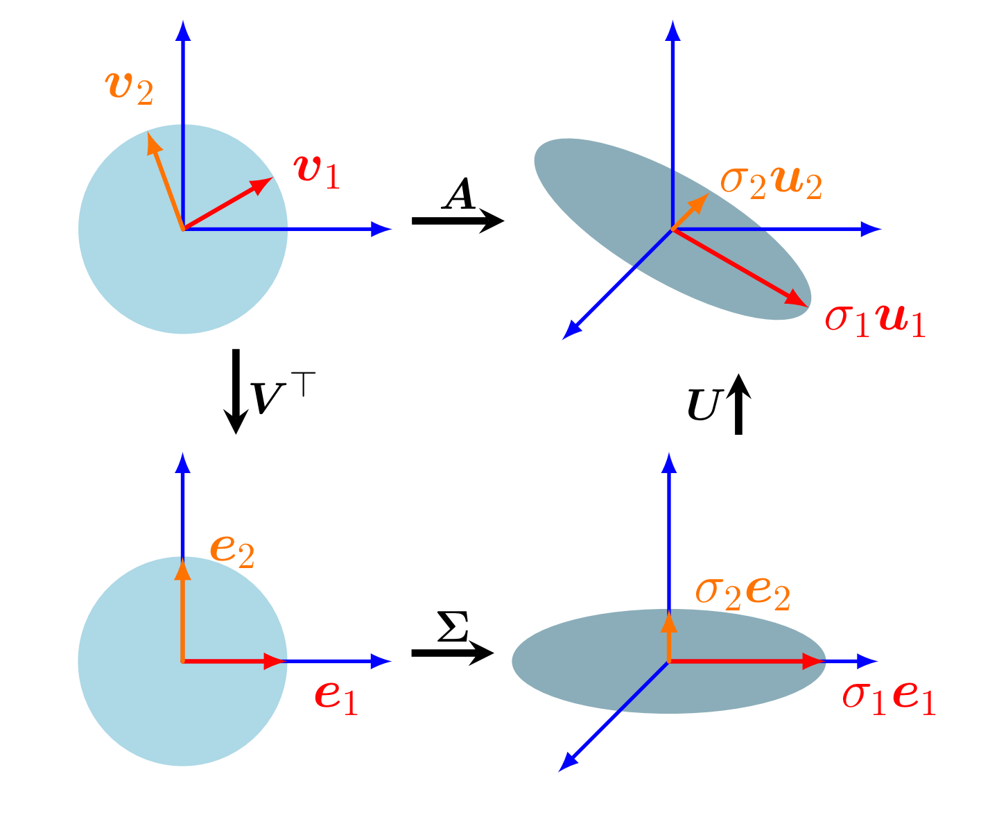 Geometric intuition for SVD - Vectors v1 and v2 of input space are transformed by A. We decompose the transformation into three components to analyze it. Image credits: Figure 4.8 of MML Book